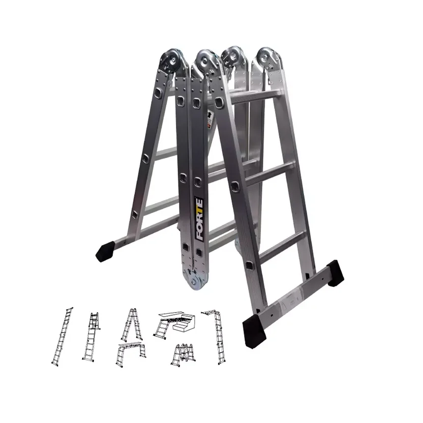 ¡Optimiza tus trabajos con la Escalera Multifuncional Forte! Con una altura máxima de 3.7 metros y fabricada en aluminio resistente, esta escalera articulada es la solución perfecta para tus proyectos. Sus 12 pasos y 4 cuerpos te brindan versatilidad y seguridad en cada tarea.